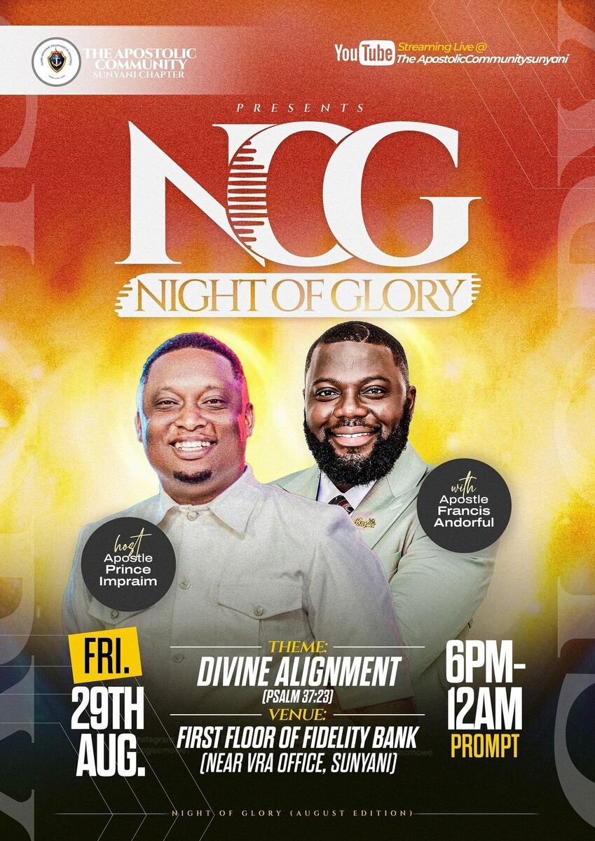 ✨Night of Glory, August Edition is back with a powerful spiritual experience! Join us for an evening filled with worship, praise, and divine blessings. Immerse yourself in a holy atmosphere as we come together to exalt and glorify the Lord. Come expectant and ready to encounter God's glory! 🙏🔥
