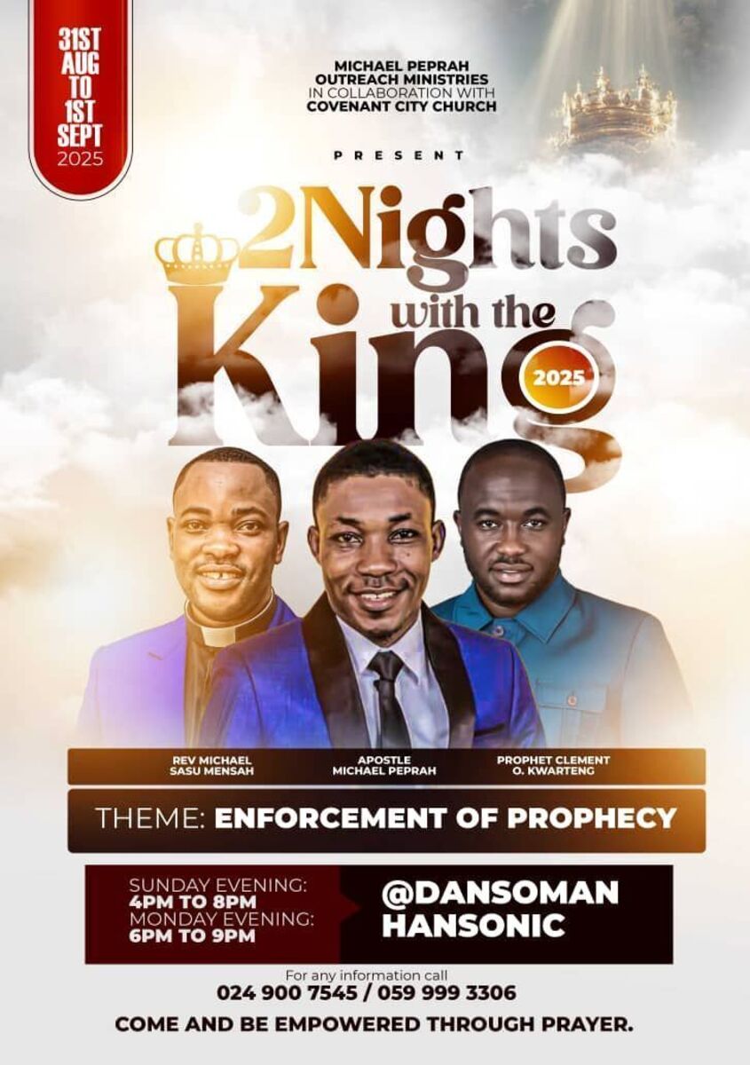 Experience an unforgettable spiritual and cultural event with Night with the King. This special gathering offers attendees a chance to participate in two nights of inspiring worship, prayer, and community bonding. Join us for an evening filled with powerful testimonies, uplifting music, and an opportunity to be a part of a vibrant faith-filled atmosphere. Whether you're seeking spiritual renewal or a chance to connect with like-minded individuals, this event promises a memorable experience. Donβt miss out on this divine gathering where every guest is treated as a VIP! β¨π