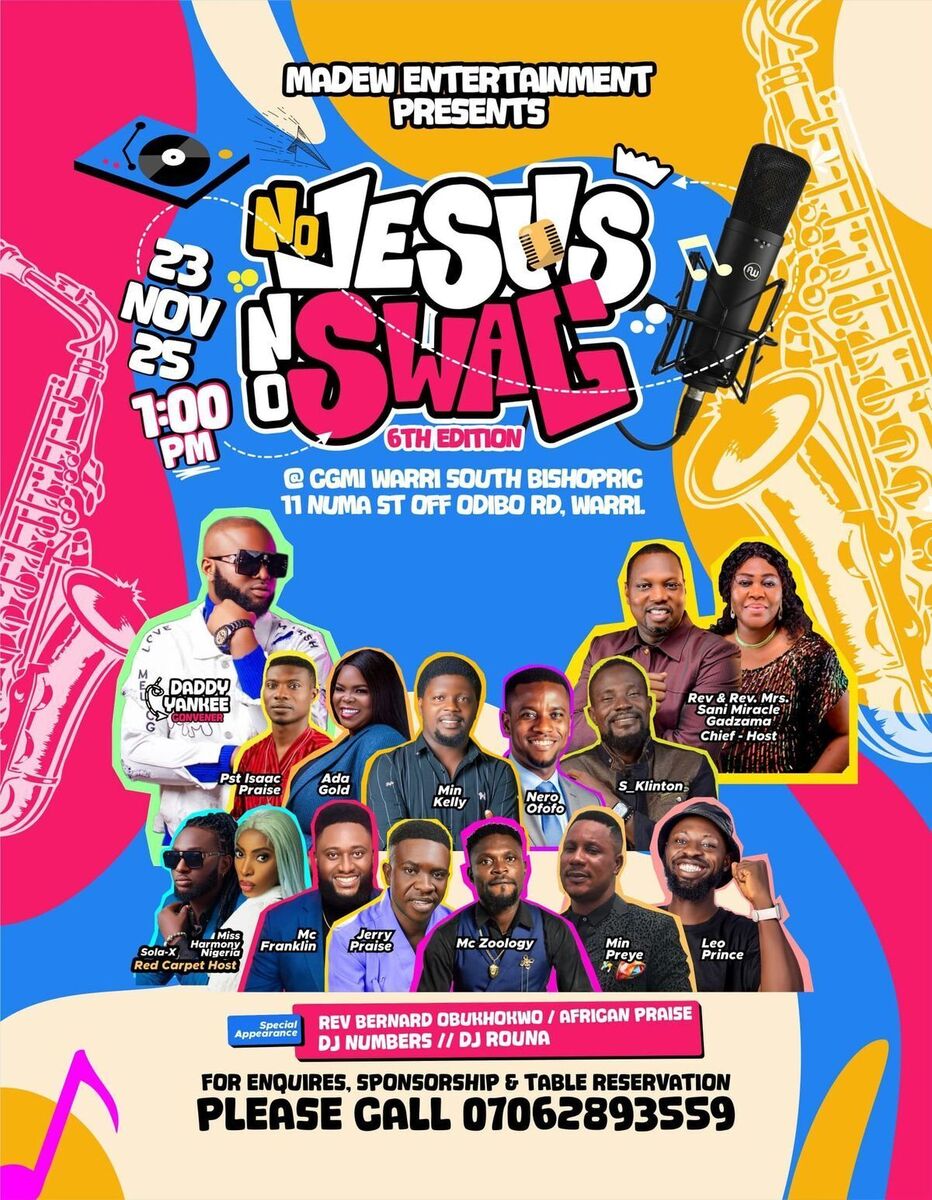 ๐ฅ Get ready, Warri! The highly anticipated 6th Edition of NO JESUS NO SWAG is here! Experience an unforgettable gospel concert filled with inspiring worship, powerful performances, and a vibrant atmosphere that will uplift your spirit. ๐ถโจ