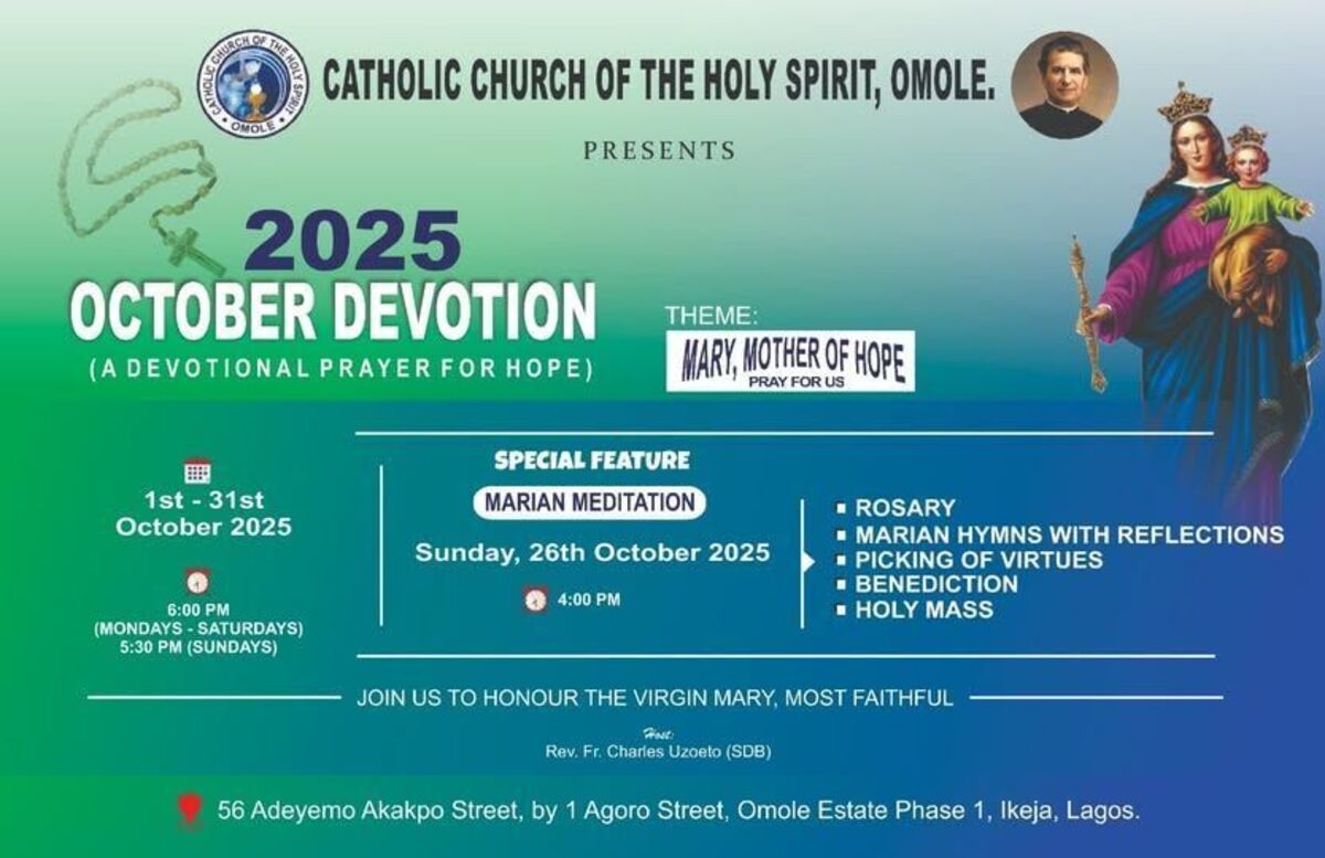 Join us at the Catholic Church of the Holy Spirit Omole for a spiritually enriching experience. Engage in prayer, fellowship, and spiritual growth as we come together to celebrate faith and community. Whether you're a regular parishioner or a first-time visitor, everyone is welcome to partake in this meaningful event. Don't miss this opportunity to renew your faith and find hope in the blessings of October! โ๏ธ๐