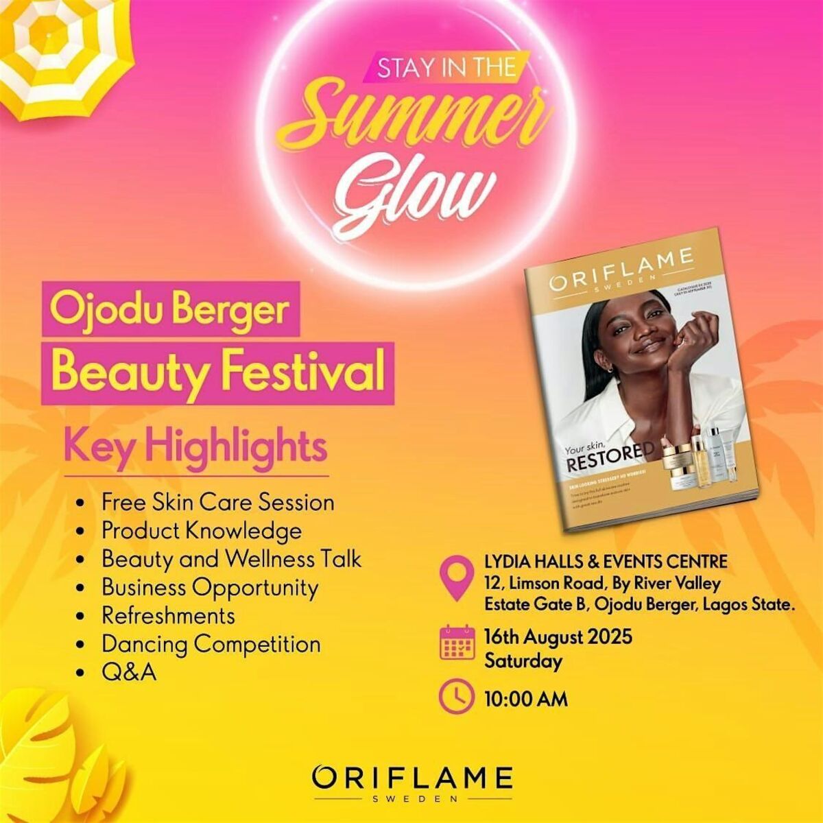 β¨ Get ready to glow, level up, and explore the world of beauty and wellness at the Ojodu Berger Beauty Festival! Hosted at Lydia Halls and Events Centre, this vibrant event offers a perfect blend of fun, learning, and opportunities. Enjoy free facials using premium skincare products, participate in inspiring wellness talks, test exciting beauty products, and stand a chance to win fantastic giveaways. Whether you're interested in transforming your beauty routine or exploring business opportunities with Oriflame, this event is your gateway to a more confident and radiant you! π