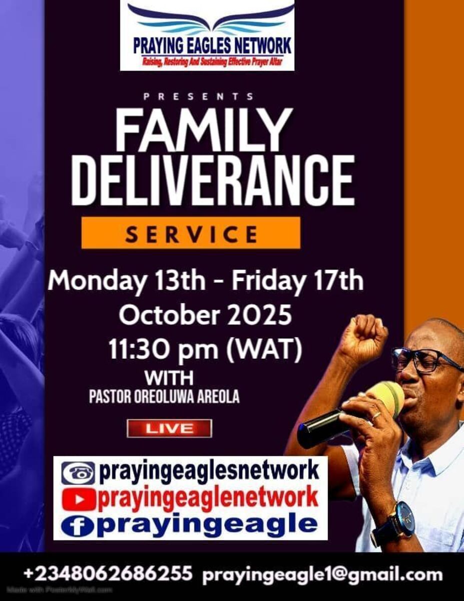 π Join us for the ONLINE FAMILY DELIVERANCE event, a spiritual journey designed to bring healing and liberation to families. Over five days, from Monday, October 13th to Friday, October 17th, 2025, participants will engage in powerful deliverance sessions from the comfort of their homes. ποΈβ¨