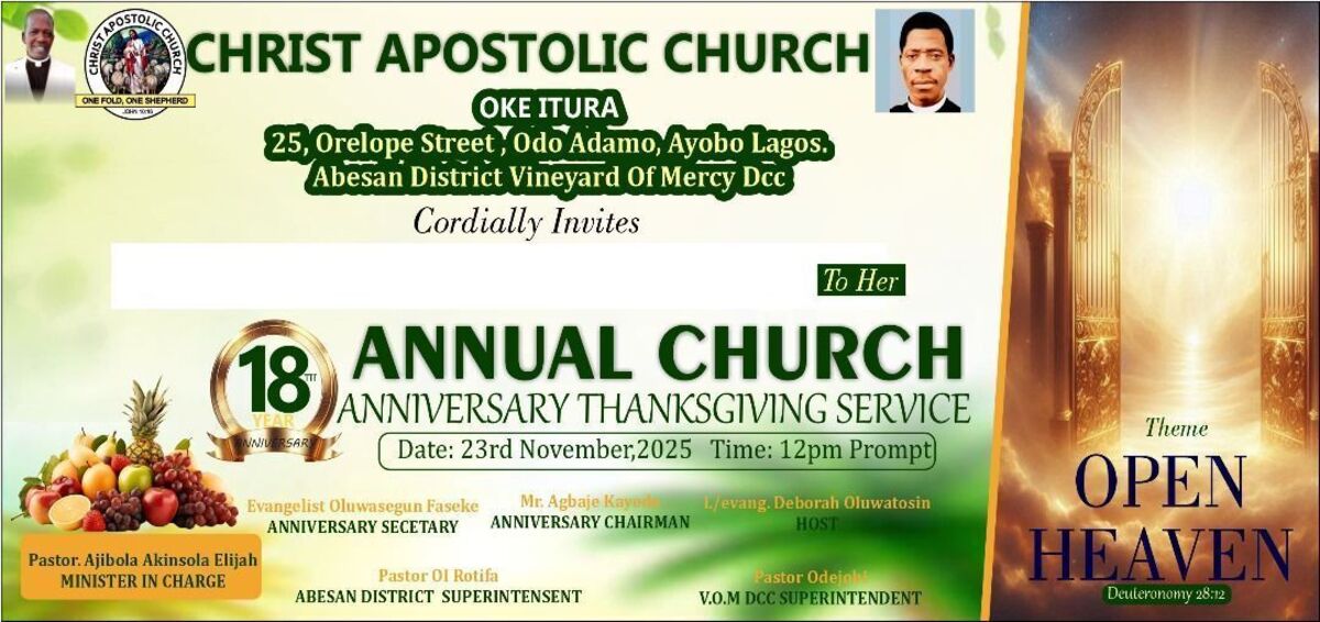 Join us in celebrating the 18th anniversary of Open Heaven! This inspiring event promises a day filled with spiritual upliftment, powerful worship, and divine encounters. Experience a vibrant atmosphere where faith and fellowship come together to create an unforgettable experience. Whether you're seeking spiritual renewal or simply looking to connect with like-minded believers, this event is perfect for you! Don't miss out on an opportunity to be part of something meaningful and uplifting. Come prepared to be blessed and to witness miracles unfold. ๐๐โจ