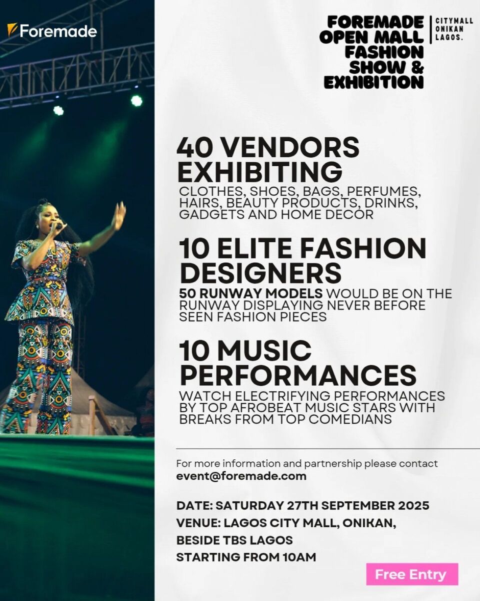 π Get ready for an extraordinary fashion extravaganza at the Open Mall Fashion Show! Witness the stunning showcase of top celebrity fashion designers, 50 glamorous models, and 10 talented music artists all coming together for a day of style, music, and entertainment. This event promises to be a vibrant celebration of fashion and art, set in the iconic The City Mall Lagos Island. Powered by Foremade and produced by Starr and Glenn, it's the perfect event for fashion enthusiasts, trendsetters, and fun lovers alike! πΆπ
