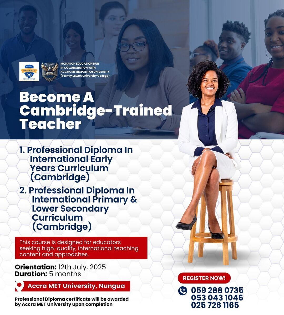 Become a Cambridge-Trained Teacher! Join the MONARCH EDUCATION HUB in collaboration with ACCRA METROPOLITAN UNIVERSITY (formerly Laweh) and earn a Professional Diploma in: