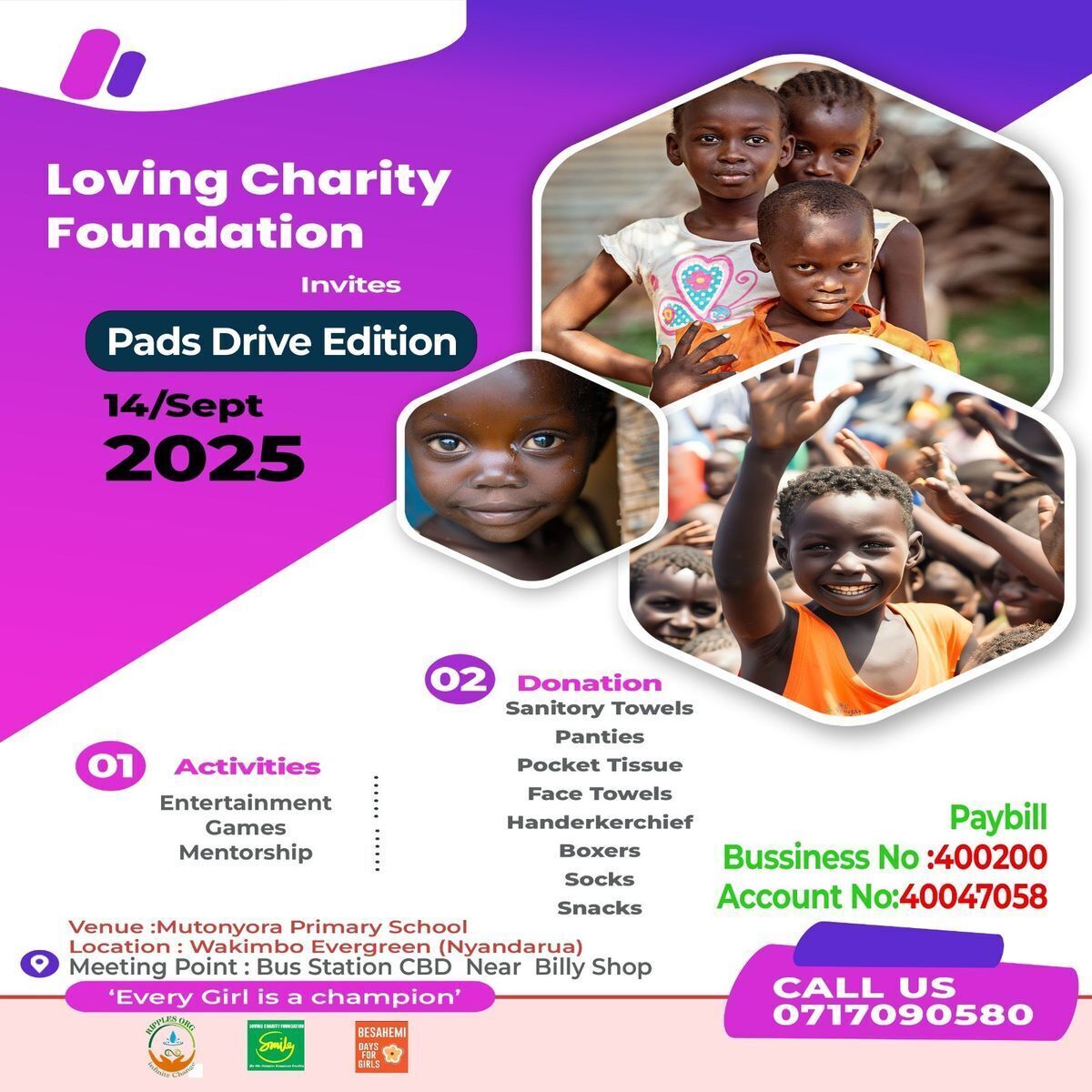 Join us for the PADS DRIVE EDITION organized by Loving Charity Foundation, a heartfelt charity event dedicated to empowering girls and women in Nyeri County. This inspiring event features entertainment, engaging games, and mentorship sessions aimed at creating awareness and providing essential sanitary products. Participants will have the opportunity to donate sanitary towels, panties, pocket tissues, face towels, boxers, socks, and snacks to support girls' health and dignity. The event promises a day of community spirit, empowerment activities, and meaningful contributions. Come be part of this impactful initiative and help make a difference! ππ