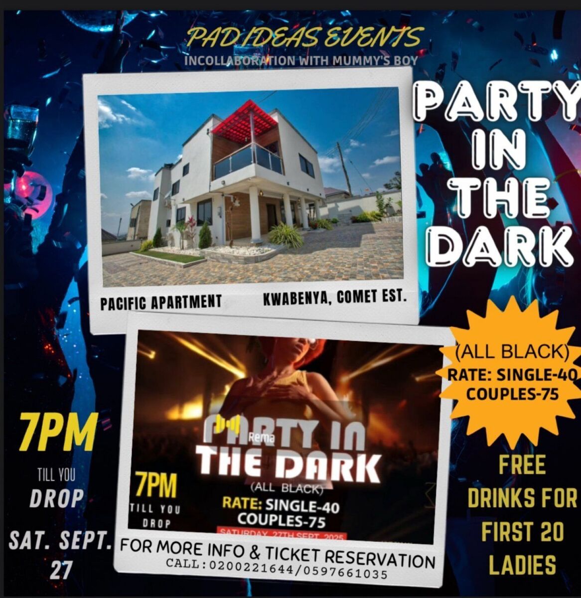 Get ready for an electrifying night at Party In The Dark brought to you by Motion Realm Studios! 🎉✨ Dive into a pulsating atmosphere filled with vibrant energy, infectious beats, and unforgettable moments. Set against the stunning backdrop of Pacific Apartments, this event promises a night of dance, connection, and pure entertainment. Whether you're a party enthusiast or looking to experience the best nightlife in Accra, this is the event you can't afford to miss! Come light up the dark and create memories that will shine forever. 🌟🔥