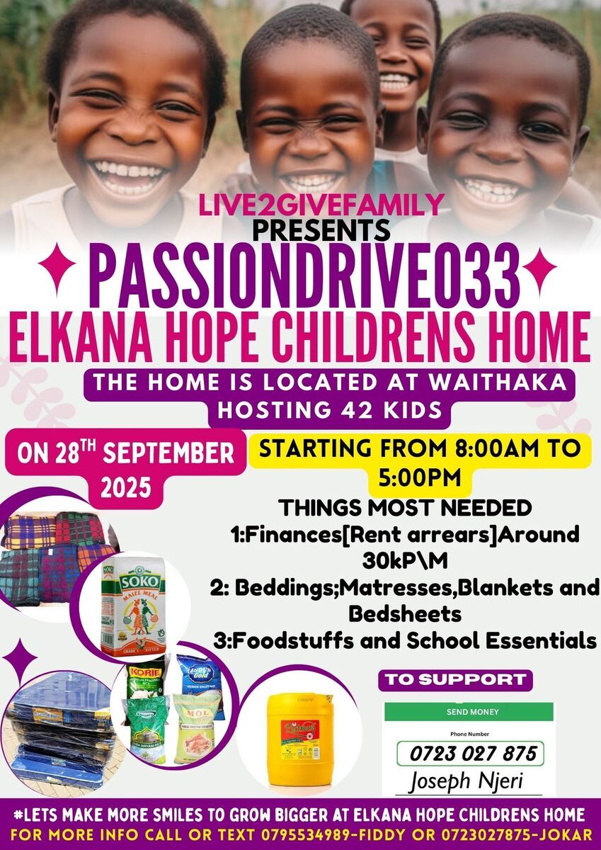 Join us for an inspiring and heartfelt event at Passiondrive033, held at Elkana Hope Children's Home in Waithaka, Dagoretti. This gathering is all about spreading love, creating smiles, and making a positive impact in the community. Whether you're looking to connect with like-minded individuals or contribute to a noble cause, Passiondrive033 offers a warm and welcoming environment to do just that. Come experience a day filled with joy, meaningful interactions, and the spirit of giving. 🎉💖