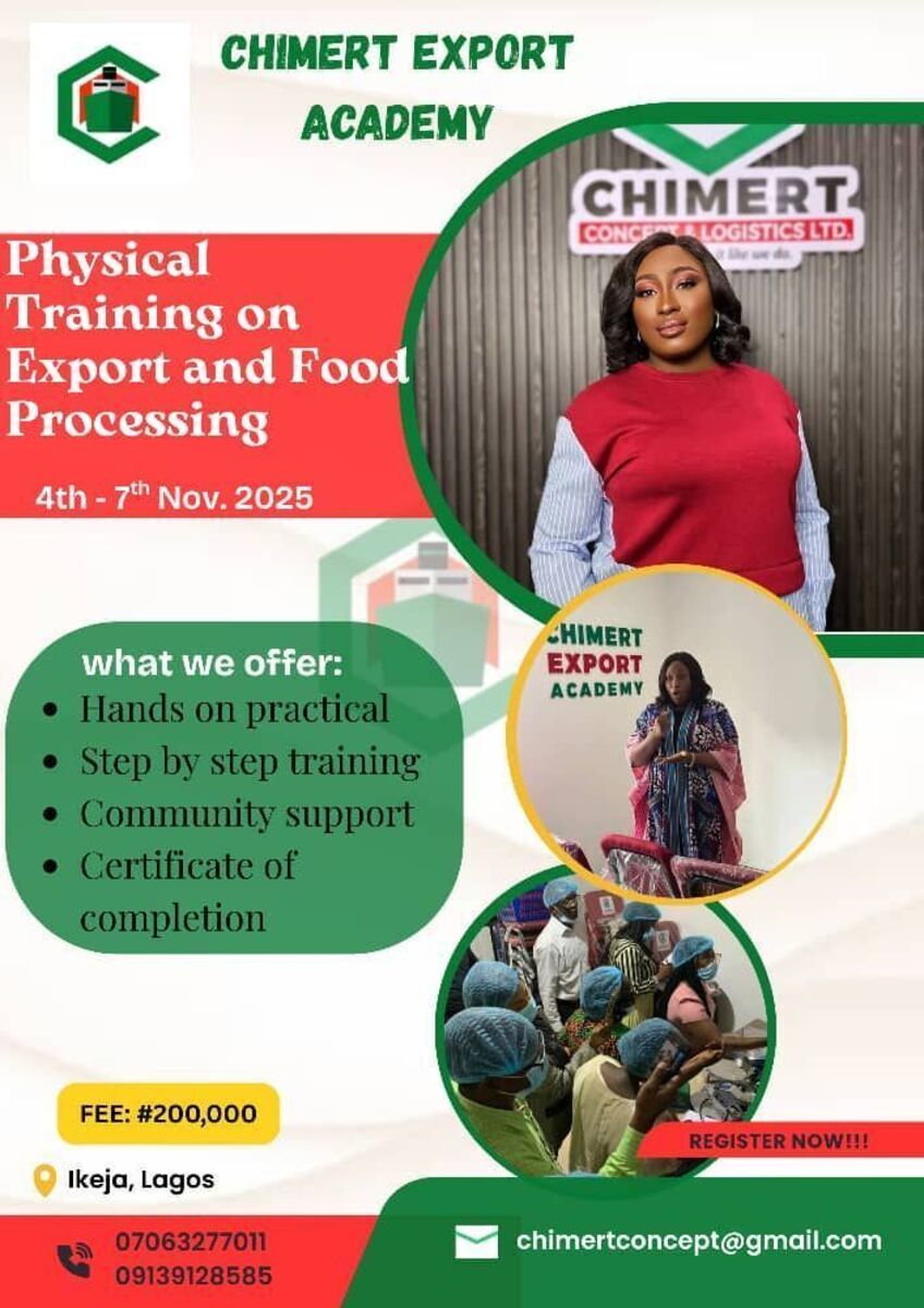 ๐ Unlock the secrets of export and food processing with hands-on training! This event is your gateway to mastering export techniques and food processing skills that can elevate your business or personal expertise. Led by Chimert Concepts & Logistics Ltd, this workshop offers practical insights, industry tips, and networking opportunities. Whether you're a beginner or looking to sharpen your skills, this training promises an engaging, informative experience. Don't miss out on the chance to grow your knowledge and connect with like-minded professionals. ๐โจ