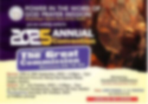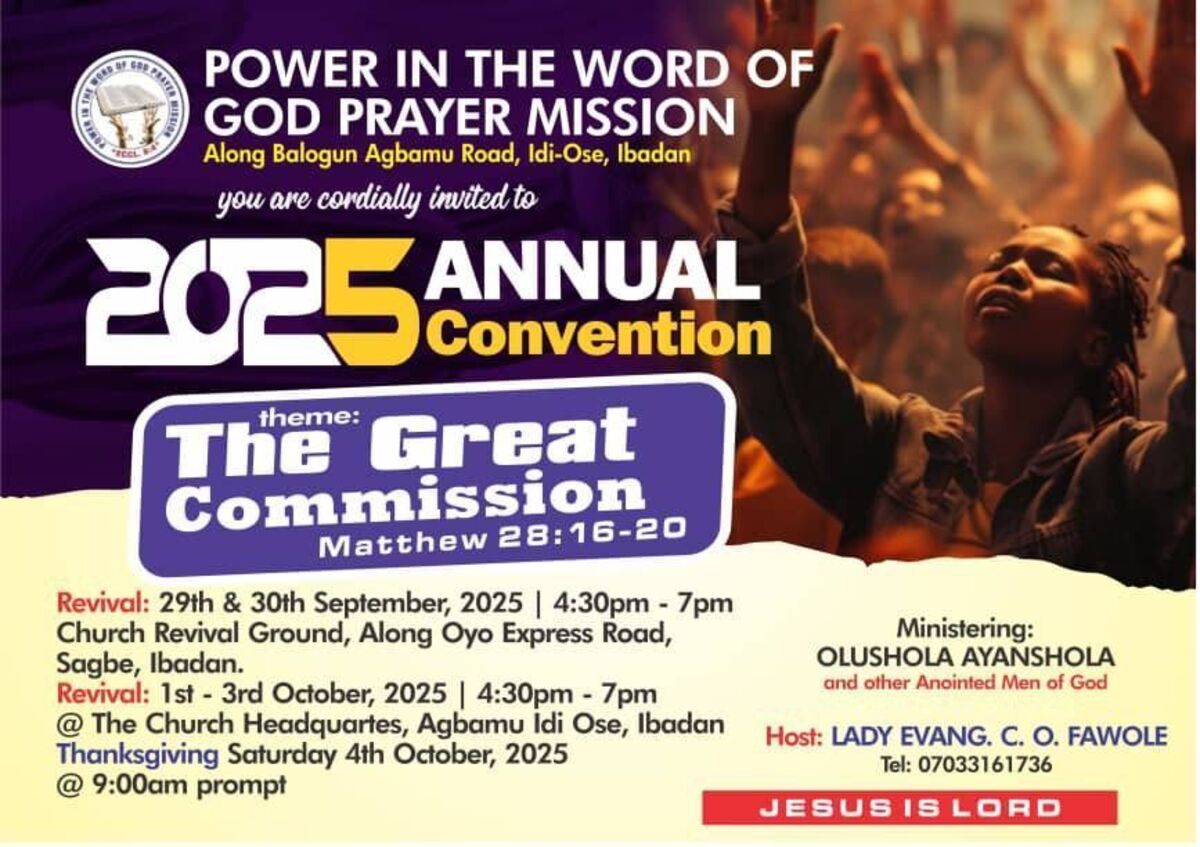Join us for the POWERDEM CONVENTION 2025, a significant spiritual gathering hosted by Power in the Word of God Prayer Mission - Powerdem. This event features a series of Revival services and a grand Thanksgiving celebration, designed to uplift and inspire attendees through powerful teachings, prayers, and worship. Experience the presence of anointed ministers, including Olushola Ayanshola and others, as they lead you into a transformative encounter with God. Hosted by Lady Evang. C. O. Fawole, this convention promises spiritual renewal, divine impartation, and a memorable time in God's presence. Don't miss this opportunity to be blessed and strengthened in faith! β¨π