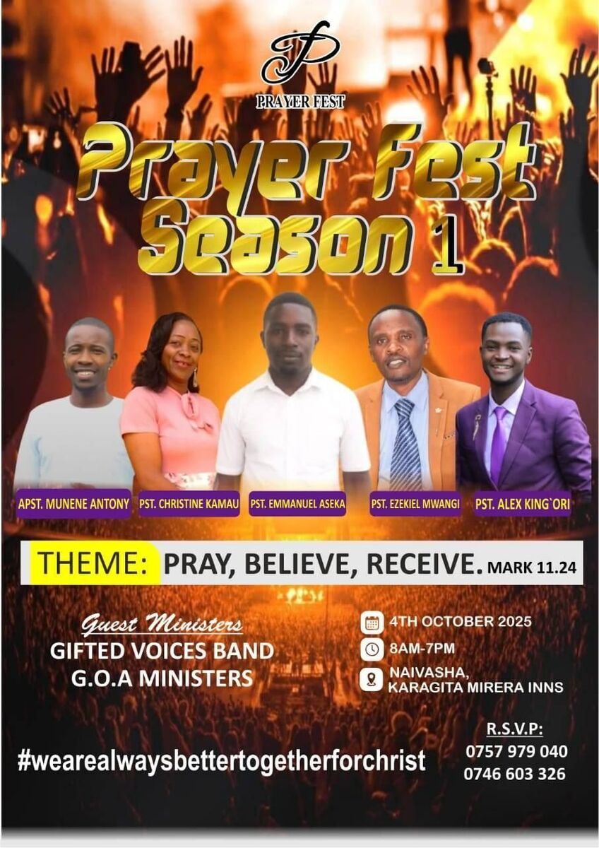Join us for the inaugural Prayer Fest Season 1 — a vibrant gathering dedicated to spiritual renewal and communal prayer. Experience an inspiring day filled with worship, prayer sessions, and communal blessings in the serene setting of Karagita Naivasha. This event is perfect for individuals seeking spiritual growth, families looking to unite in faith, and communities eager to celebrate together. 🌟✨