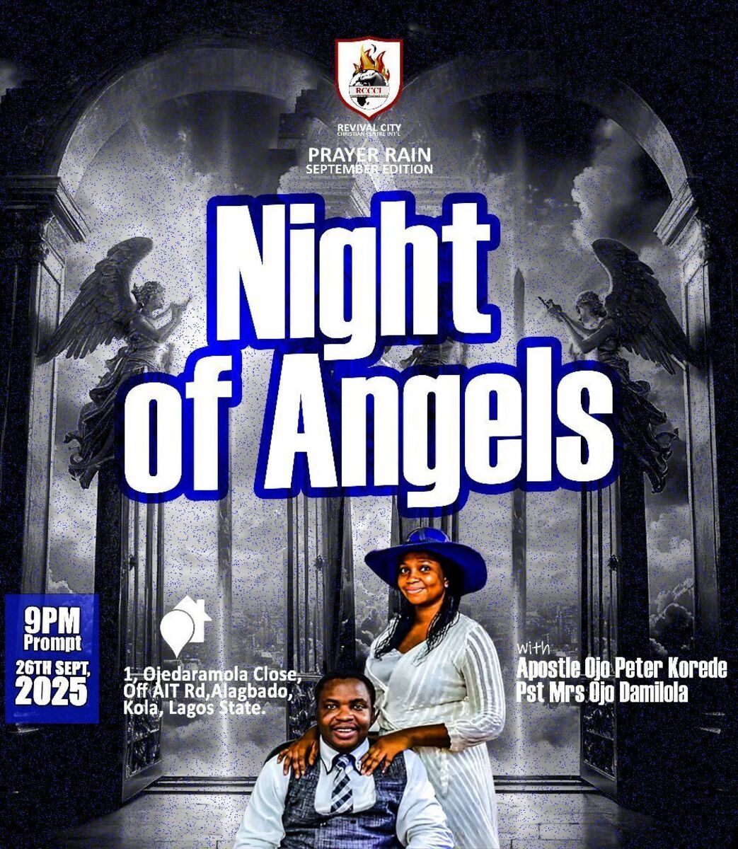 Join us for the highly anticipated Prayer Rain September Edition, a night dedicated to spiritual awakening and divine encounter. Under the inspiring theme: Night of Angels, this event promises to be a supernatural experience filled with powerful prayers, worship, and prophetic ministrations. Come expectant and prepared to encounter the supernatural presence of God in an atmosphere charged with faith and breakthroughs. Don’t miss this divine appointment! ✨🙏