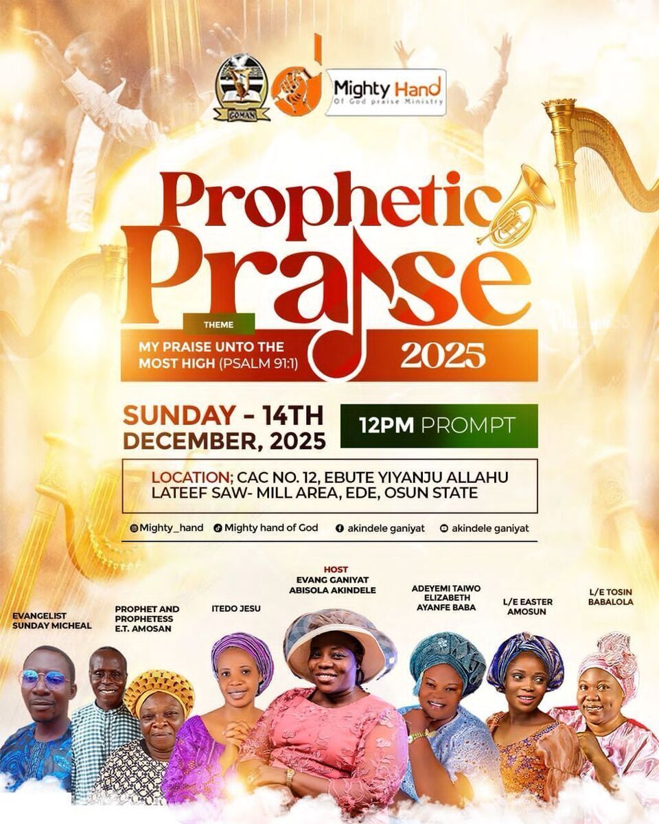 πΆπ Experience a life-changing prophetic praise concert where music and prophecy unite in a powerful encounter! Join us for an uplifting event featuring powerful worship, prophetic ministrations, healing, salvation, and the Word of Prophecy. This is a divine opportunity to lift your spirit and connect with the Most High God in an atmosphere filled with praise and miracles. Expect an inspiring time of worship, breakthrough, and spiritual renewal. Invite others and be part of this glorious worship experience! πβ¨