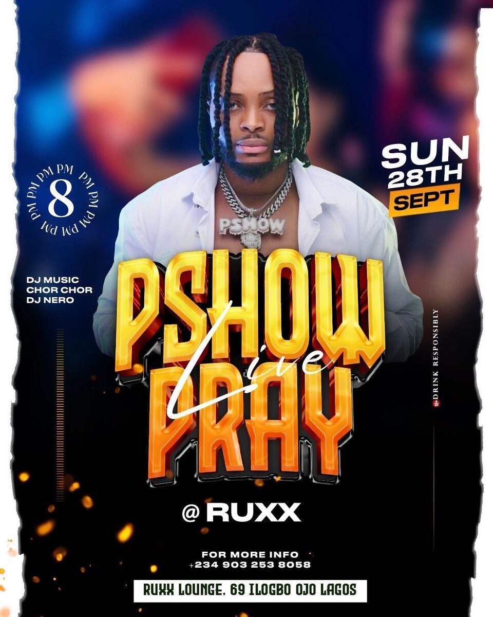 π€ Experience an electrifying live performance by Pshowpray at Ruxx Lounge, Ojo Ilogbo, Lagos. Join us for an unforgettable event filled with music, energy, and entertainment. Donβt miss this exclusive opportunity to see Pshowpray perform live in Lagos! πΆβ¨