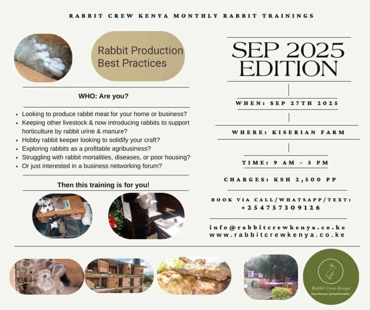 π Join our comprehensive Rabbit Production Training and become proficient in rabbit farming techniques! This intensive program is designed to equip aspiring farmers with practical skills, expert knowledge, and hands-on experience to succeed in rabbit rearing. Whether you're a beginner or looking to expand your livestock skills, this training offers valuable insights into breeding, nutrition, health management, and business development. Connect with a vibrant community of learners from across Kenya and start your journey towards profitable rabbit farming today! π