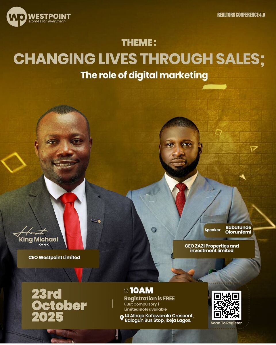 🌟 REALTORS CONFERENCE 4.0 is set to transform the way real estate professionals approach sales and marketing. This engaging event delves into the pivotal role of digital marketing in changing lives through effective sales strategies. Whether you're a seasoned realtor or just starting out in Lagos and neighboring regions, this conference offers invaluable insights, secrets of successful sales, and networking opportunities with guest speakers who are leaders in the industry. Join us for a day of learning, inspiration, and growth. Time: 10:00 AM daily. Location: No 14 Alhaja Kofoworola Crescent, Balogun Bus Stop, Ikeja, Lagos. Don't miss out—registration is free but mandatory! Secure your spot now and be part of this transformative experience! 🚀