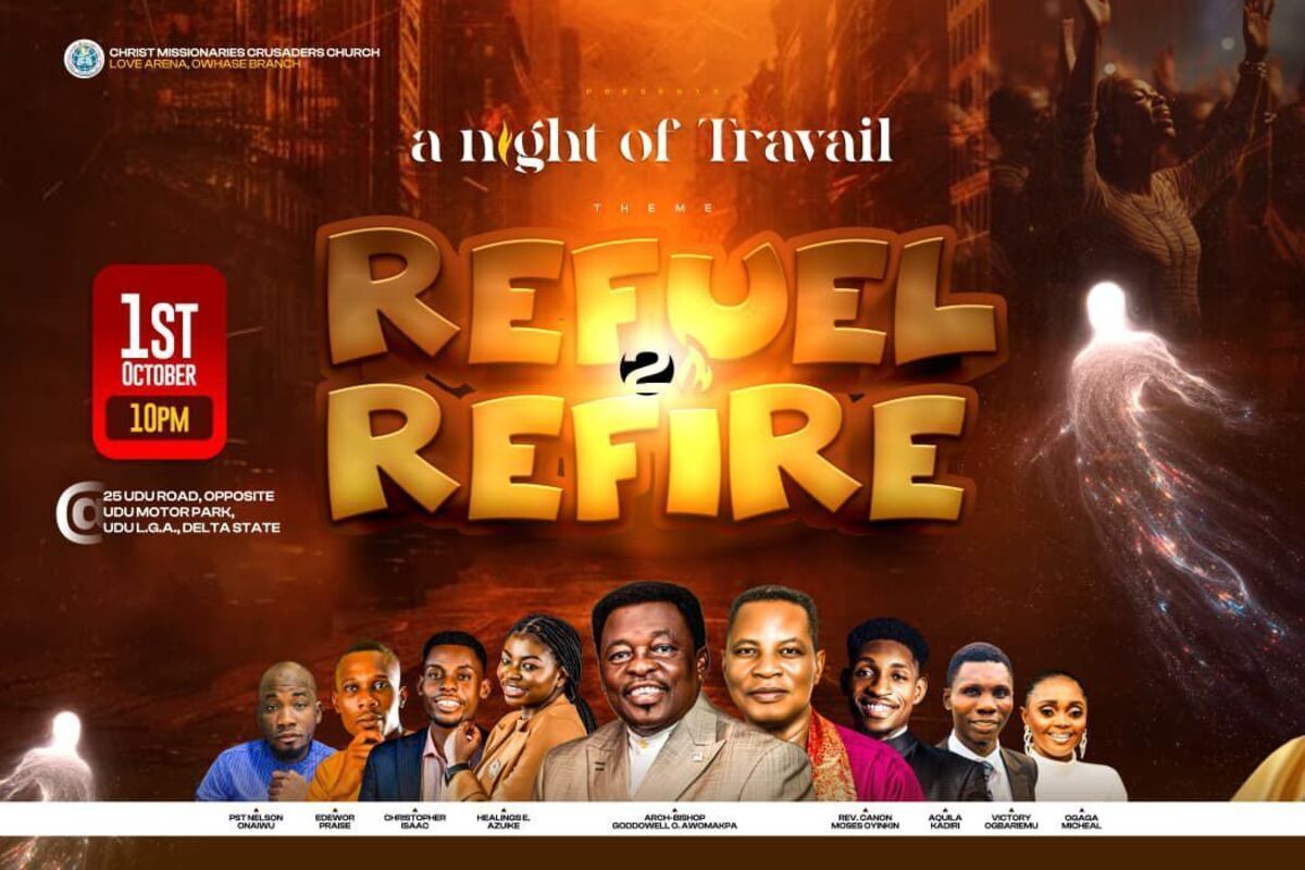 Join us for an electrifying night event, Refuel to Refire, a vibrant gathering designed to ignite passion and energy among attendees. Experience a night filled with dynamic performances, engaging activities, and a lively atmosphere at the renowned Christ Missionaries Crusaders Church, Owhase - Love Arena. Whether you're looking to network, be inspired, or just have a memorable evening, this event promises to deliver excitement and community spirit. Don't miss out on this unique opportunity to refuel your enthusiasm and refire your passions! ππ₯