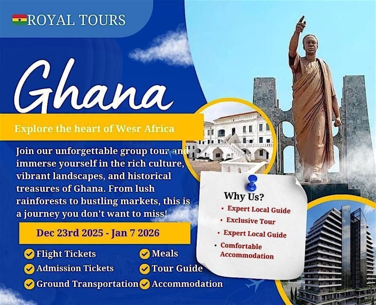 Embark on a majestic journey through Ghana with ROYAL TOURS! 🌍✨ This exclusive experience invites you to explore Ghana’s rich culture, stunning landscapes, and historic landmarks in a luxurious and immersive way. From scenic beaches to vibrant city tours, every moment promises unforgettable memories. Enjoy a blend of relaxation, adventure, and authentic Ghanaian hospitality that will leave you inspired and rejuvenated. Whether you're seeking cultural insights or scenic escapes, ROYAL TOURS offers a royal treatment for explorers of all kinds. Don’t miss this opportunity to discover Ghana like royalty! 👑🌅