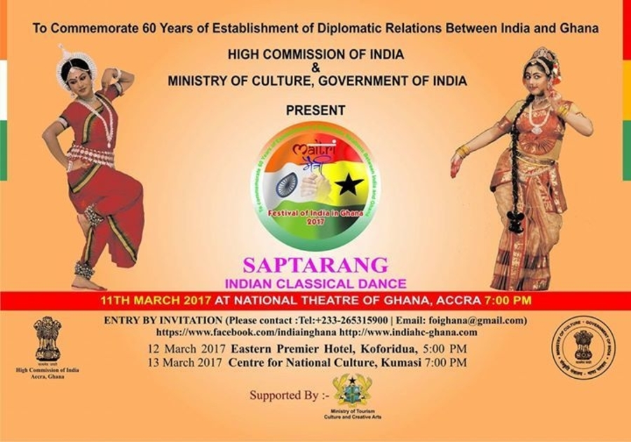 To Commemmorate 60 Years of Establishment of Diplomatic Relations Between India and Ghana - "SAPTARANG" an Indian Classical Dance performance on 11th March 2017 at National Theatre of Ghana at 7 PM. Entry by Invitation (Please contact: Tel.+233 265315900 / Email: foighana@gmail.com)
