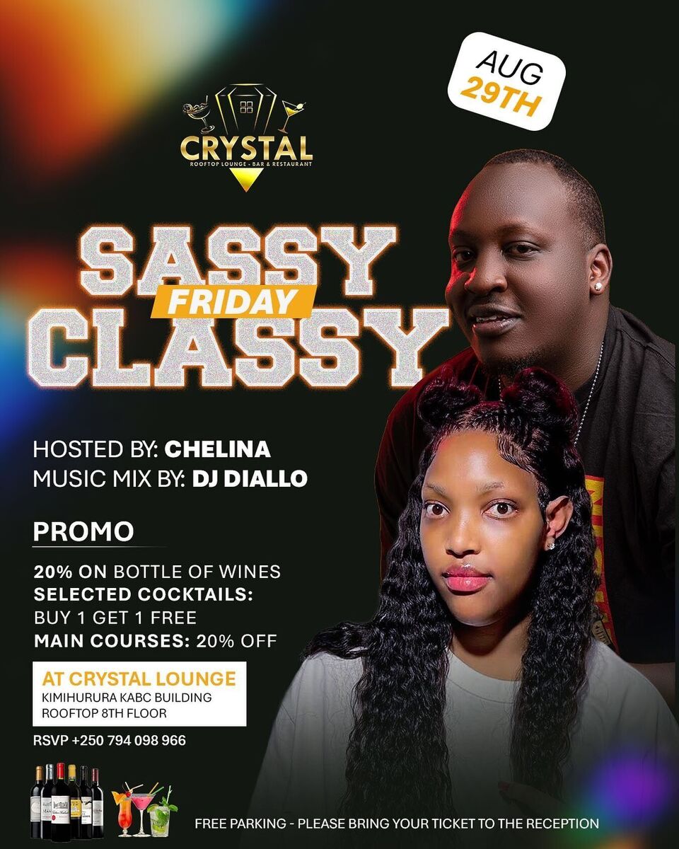 Get ready for an unforgettable evening at Sassy Classy Friday hosted at the luxurious Crystal Lounge! ๐โจ Experience an elegant night filled with great music, vibrant atmosphere, and exclusive offers. Join us for a night of fun, sophistication, and entertainment with live DJ sets and fantastic vibes. Don't miss out on our special deals: 20% off wines and cocktails, Buy 1 Get 1 Free, and 20% off main courses. Plus, enjoy free parking at the Kimihurura KABC Building, Rooftop 8th Floor. Mark your calendar for August 29th and bring your friends for an evening of classy celebration! ๐ท๐ถ