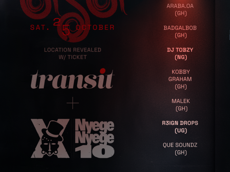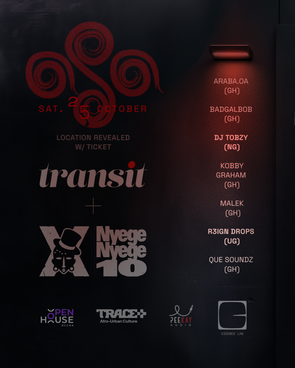 Our sound journey will be guided by R3ign Drops (UG), DJ Tobzy (NG), Kobby Graham (GH), Badgalbob (GH) and the Transit collective; Araba.OA, Malek and Que Soundz.