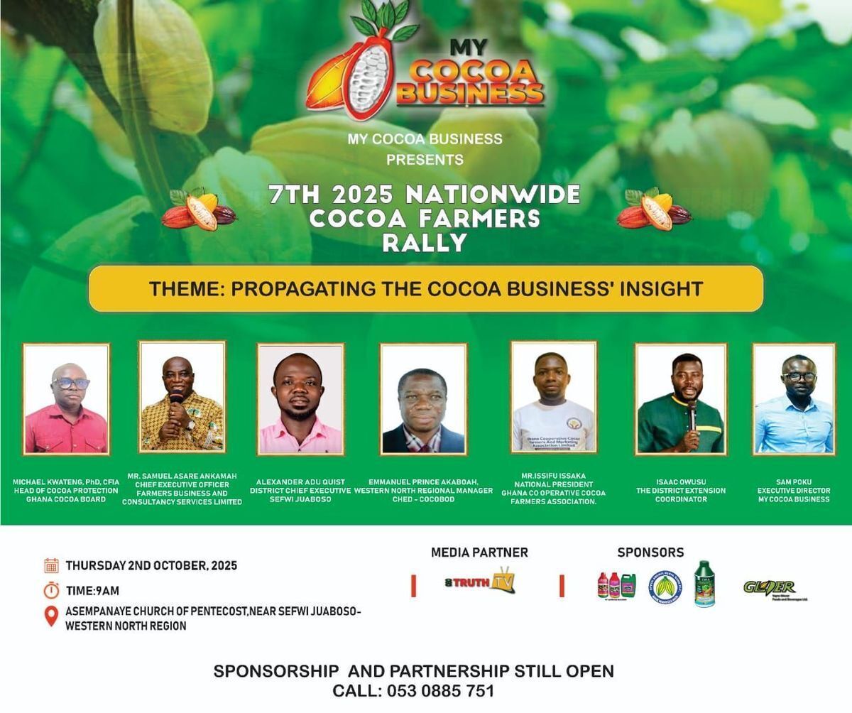 🚩 Join us for the exciting continuation of the nationwide cocoa farmers' rallies! After the successful 6th Cocoa Farmers Rally at Sefwi Bekwai on October 1st, we head directly to Sefwi Juaboso in less than 24 hours for the 7th event of 2025. 🌱