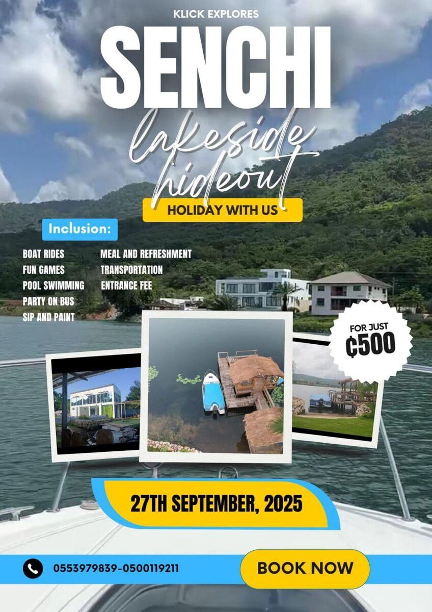 SENCHI Lakeside Hideout is a fun and relaxing getaway organized by Klick Explores, happening on 27th September, 2025. For just ₵500 per person or ₵900 for a double package, participants will enjoy exciting activities like boat rides, fun games, pool swimming, sip and paint, and a lively party on the bus. The package includes transportation, meals, refreshments, and entrance fees—making it the perfect one-day escape to unwind and connect by the scenic lakeside at Senchi.
