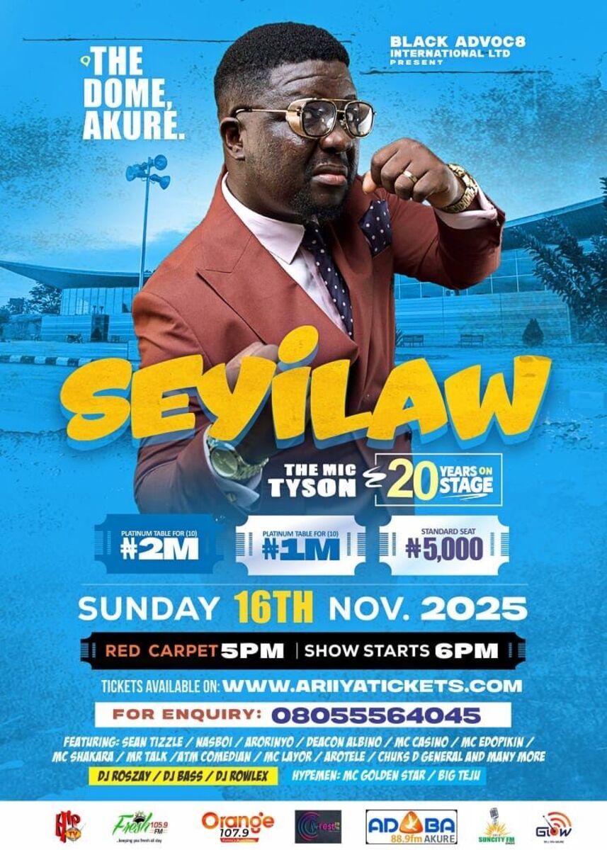 π€ Get ready for an electrifying night with Seyi Law at The Dome, Akure! Presented by Black Advoc8 International Ltd, this star-studded entertainment extravaganza promises a memorable evening packed with top-tier performances and unforgettable moments. Guests will enjoy a vibrant atmosphere featuring a lineup of renowned acts, comedy, music, and entertainment that will keep you on your feet all night long. Whether you're attending for the comedy, the vibe, or to see Seyi Law live, this event is the place to be! π