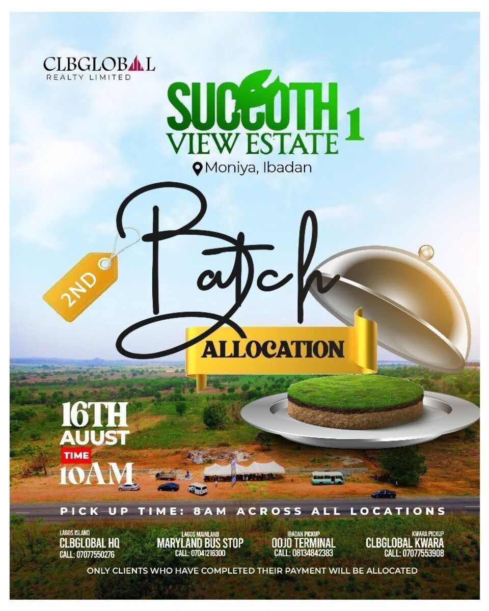 ๐ก Discover Your Dream Land at the Succoth View Estate 2nd Batch Land Property Allocation event! Join us in Moniya, Ibadan, for an exclusive opportunity to secure prime land parcels in a thriving estate. Whether you're a seasoned investor or a first-time buyer, this event offers a fantastic chance to explore lucrative real estate options.