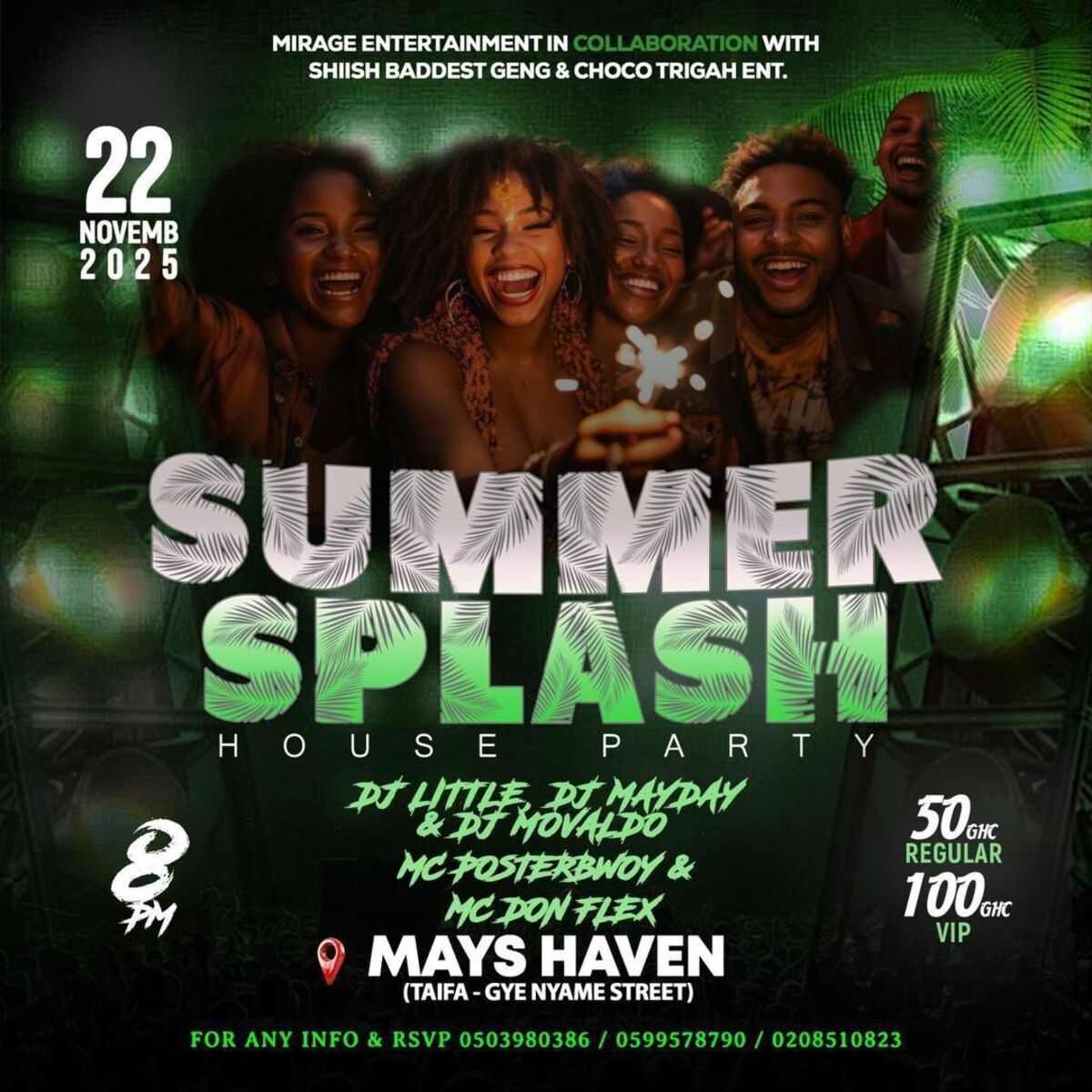 Summer splash house party happening life insyd Taifa mays haven apartment,time 8:00pm sharp get your tickets online now and come let’s party together and have more fun,can’t wait to see you all there 🎉