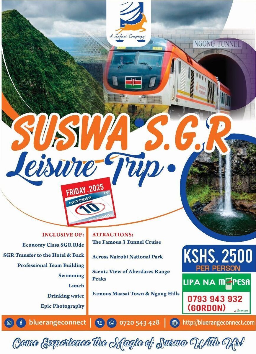 Embark on an exciting Suswa Leisure Day Trip with Bluerange Connect Limited! πβ¨ Experience the thrill of the famous 3 Tunnel Cruise across Nairobi National Park, enjoy scenic views of the Aberdares Range Peaks, explore the Maasai Town & Ngong Hills, and indulge in a day filled with adventure, relaxation, and unforgettable memories.