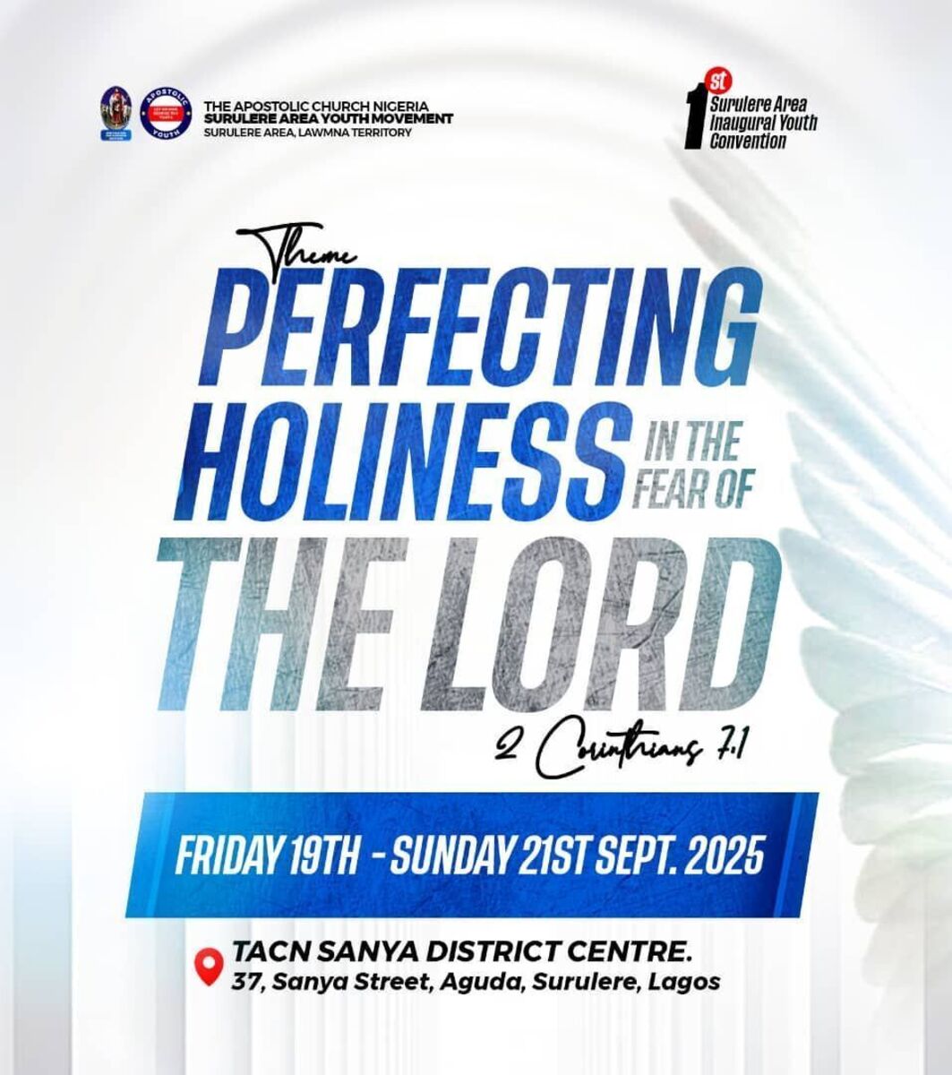 Join us at the TACN Surulere Area Youth Inaugural Convention where the theme is Perfecting Holiness in the Fear of the Lord. This inspiring event is designed to foster spiritual growth, community bonding, and leadership among youth in the Surulere area. Experience powerful teachings, vibrant fellowship, and opportunities to connect with like-minded individuals committed to living a holy and impactful life. Don't miss this chance to be part of a transformative spiritual gathering that promises to uplift and energize the youth for greater service and devotion. 🚀✨