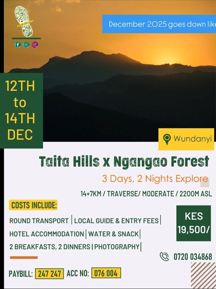 ๐ฟ Embark on an adventurous journey through the stunning Taita Hills and the lush Ngangao Forest! This 3-day, 2-night escapade offers a perfect blend of nature, hiking, and exploration. Starting early from Nairobi, travel to the scenic Wundanyi-Taita region, where you'll hike on Saturday and Sunday amidst breathtaking landscapes. Whether you're a seasoned trekker or nature enthusiast, this event promises an unforgettable outdoor experience. ๐ฅพโจ