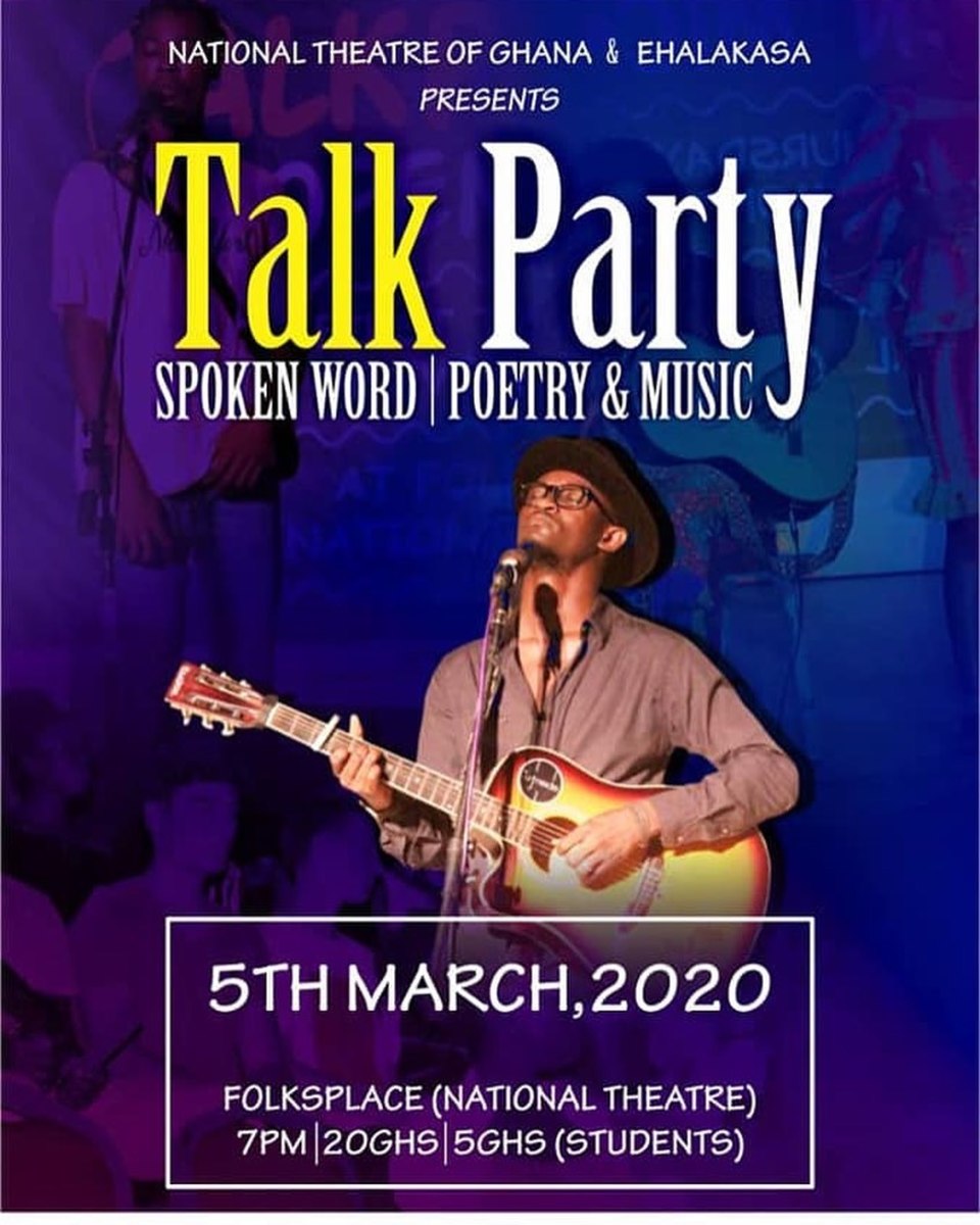 The Talk Party event is also happening soon, (Date: Thursday, 5th March, 2020) at the Folksplace, National Theatre from 7:00PM. The event is a night of spoken word, poetry and music... This event is being Organized By The National Theatre of Ghana & Ehalakasa.
