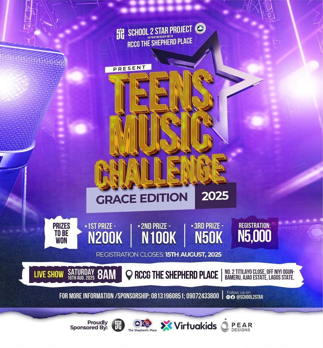 🎶 Teens Music Challenge – Grace Edition 2025 is an electrifying talent showcase brought to you by School 2 Star Project. This is your golden opportunity to shine, impress the crowd, and vie for incredible cash prizes! 💰