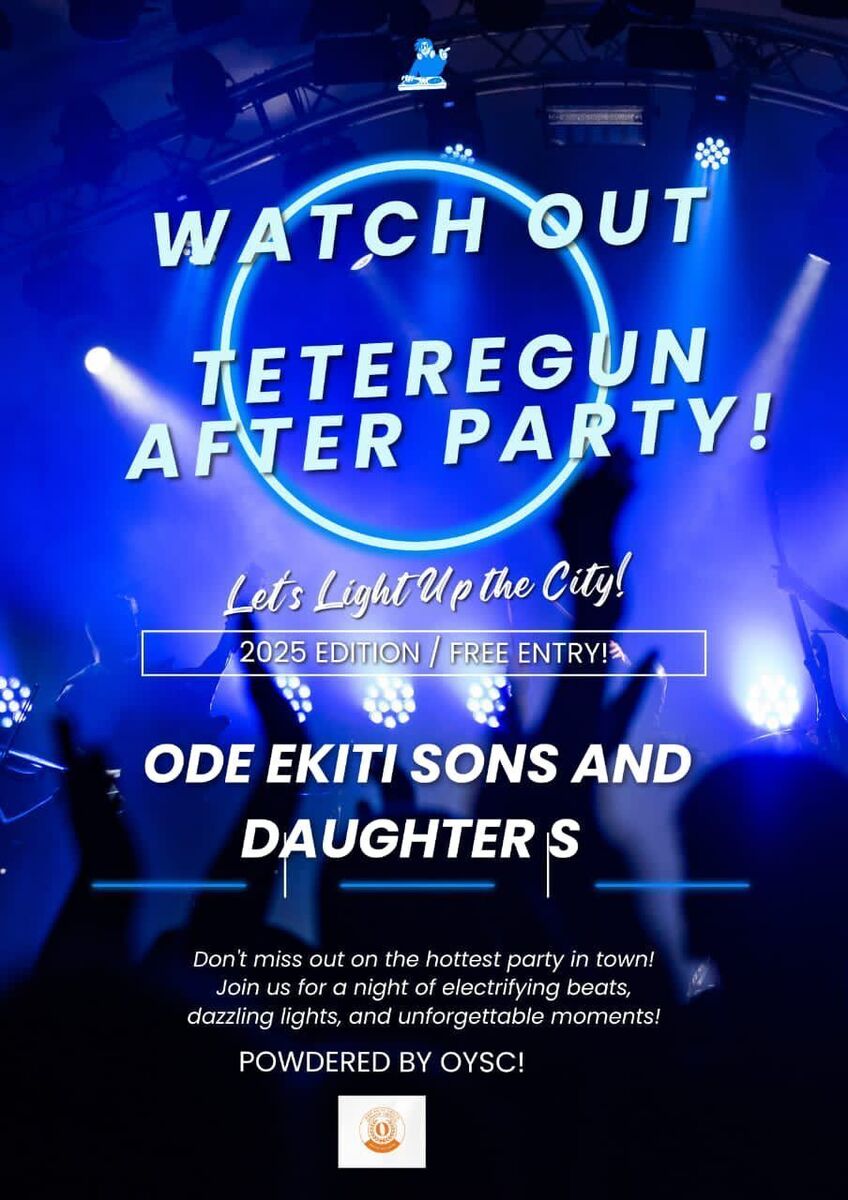 🎉 Get ready, party lovers of Ode Ekiti! The TETEREGUN AFTER PARTY is about to light up the night with an unforgettable celebration. Whether you're a fan of live music, dance, or just looking to have fun with friends, this event promises an exciting and vibrant atmosphere. Don't miss out on the biggest night of entertainment and joy — make your move now! 🚀