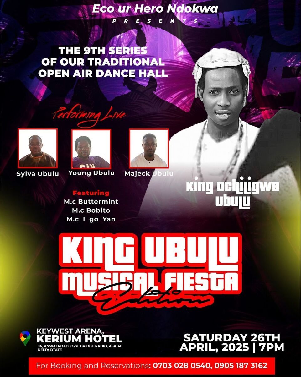 Join us for the 9th Series of our Open Air Dance Hall King Ubulu Musical Fiesta Edition! Immerse yourself in a vibrant celebration featuring live performances by Sylva Ubulu, Young Ubulu, and Majeck Ubulu at the stunning Kerium Hotels.