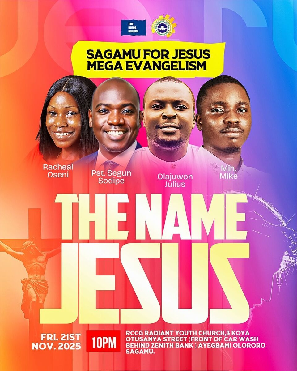 β¨ Experience a night of divine power, salvation, and revival! Join us for THE NAME JESUS eventβan electrifying evangelism night where the name of Jesus takes center stage. Be inspired by powerful worship, life-changing messages, and a vibrant atmosphere of faith and unity. This is a special opportunity to encounter Jesus afresh, witness miracles, and be part of a spiritual awakening. Whether you're seeking salvation, healing, or simply a night of spiritual renewal, this event promises to lift your spirit and shake Sagamu in the mighty name of Jesus! ππ₯
