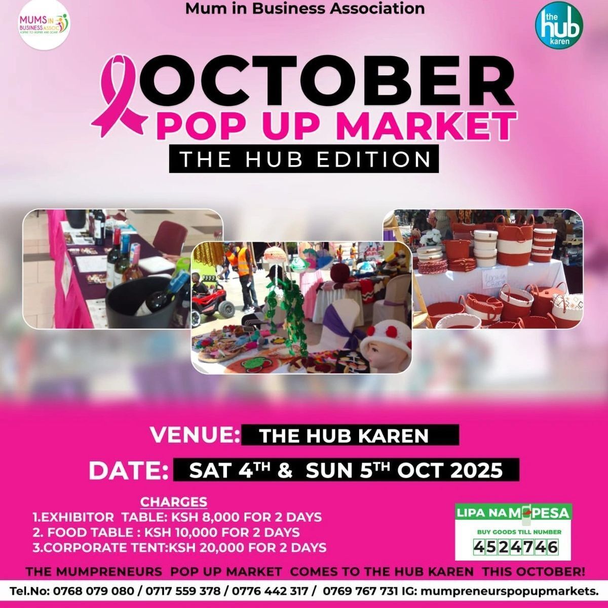 ๐ Join us at The October Mumpreneurs Pop up Market for a vibrant celebration of women in business! Hosted by the Mums in Business Association, this lively event is your opportunity to explore, shop, and connect with talented mumpreneurs showcasing their products and services. Whether you're looking for unique handmade crafts, delicious treats, or inspiring business stories, this market has something for everyone. Enjoy a friendly, community-driven atmosphere at The Hub Karen, where entrepreneurship meets fun and family. Donโt miss out on this empowering event packed with opportunities to support local women and discover amazing offerings! ๐๐ผ