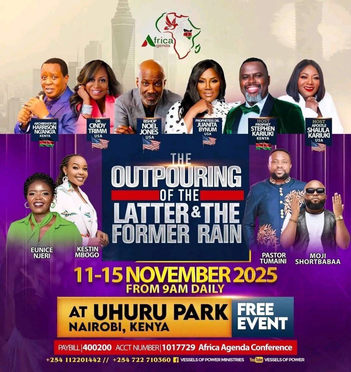 Experience a powerful spiritual revival at Uhuru Park Nairobi. Join a community coming together to reignite faith, hope, and renewal through inspiring sermons and worship sessions. This event features renowned speakers like Cindy Trimm, Dr. Juanita Bynum, Kestin Mbogo, Eunice Njeri, and Moji Shortbabaa, promising an uplifting day dedicated to divine blessings and spiritual awakening. 🌧️✨ Come and be part of this transformative gathering that celebrates God's blessings and the outpouring of the Holy Spirit. Whether you seek spiritual growth, community connection, or a moment of divine encounter, this event is designed to refresh your soul and renew your faith. Don't miss this opportunity to experience the outpouring of God's grace in a vibrant, faith-filled atmosphere! 🙌
