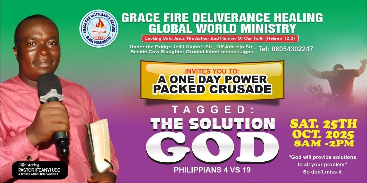 Join us for an inspiring spiritual event designed to provide solutions to your pressing problems and issues. Experience a day of divine intervention, prayer, and empowerment led by Grace Fire Deliverance Ministry Global World. Come expecting miracles and breakthroughs in a welcoming atmosphere under the bridge in Isheri, Lagos. Don't miss this opportunity to receive divine solutions and uplift your spirit! β¨π