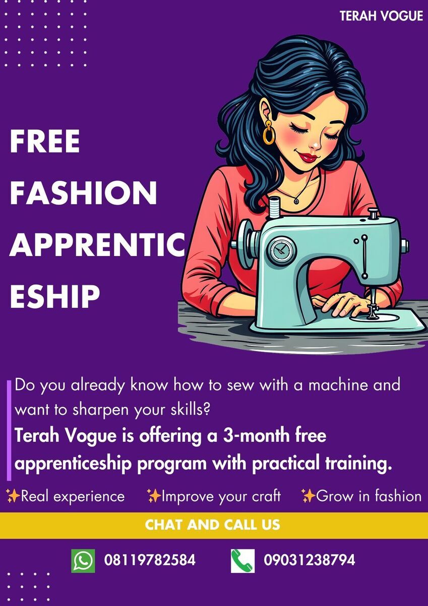 Are you passionate about fashion and looking to sharpen your sewing skills? This is your golden opportunity to gain real-world experience and grow in fashion design with Terah Vogue. Whether you're a beginner or have basic skills, this apprenticeship offers you a platform to learn, create, and excel in the fashion industry. Don't miss out on this chance to elevate your craft and build a promising career! π