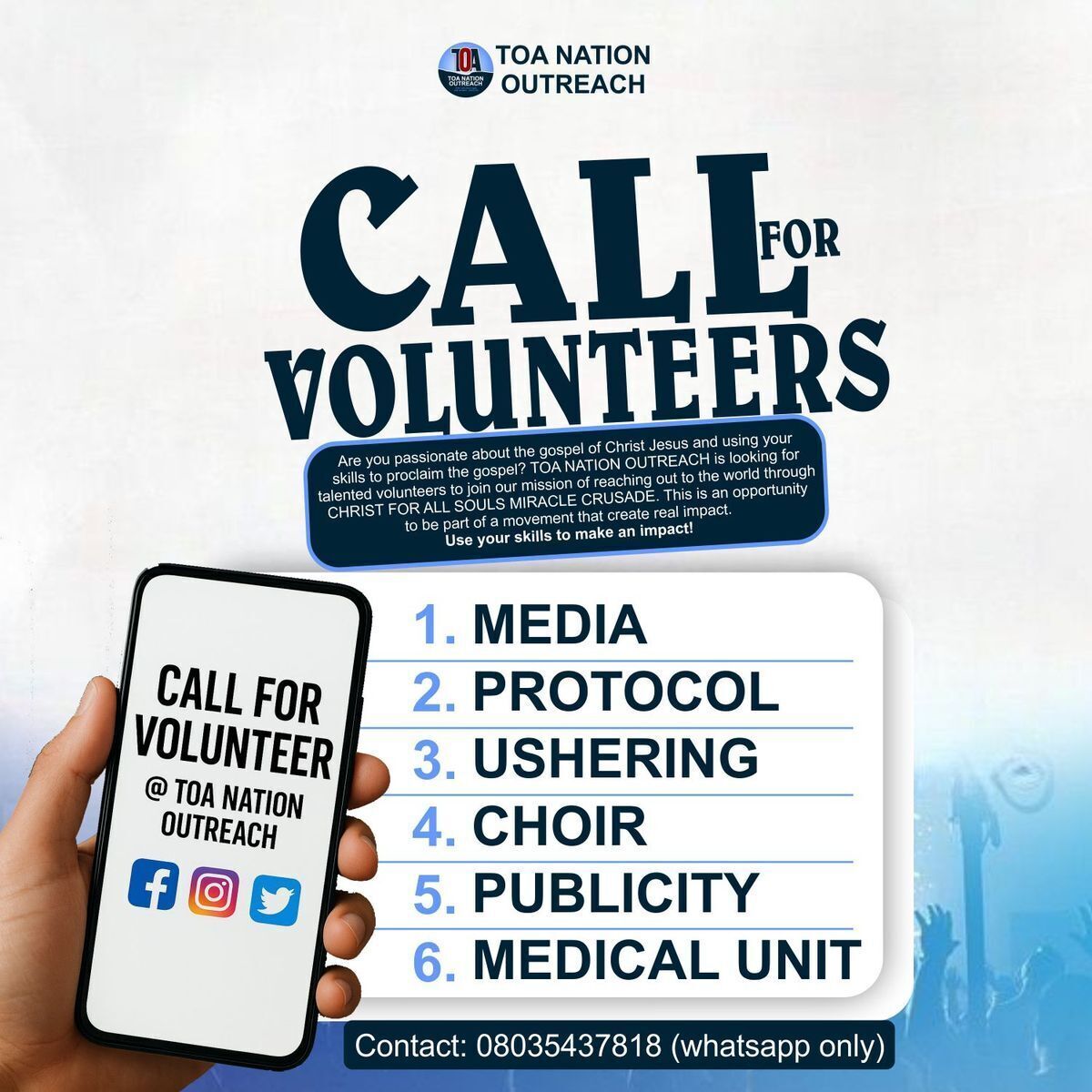 π₯π Join the TOA NATION OUTREACH and be part of a powerful movement dedicated to serving, impacting lives, and creating miracles! This event is perfect for those passionate about making a difference, whether through volunteering, gifting, or simply lending their heart. Experience an atmosphere filled with worship, inspiration, and community spirit as you participate in a cause greater than yourself. Don't miss this opportunity to be part of something meaningful and transformative. Come ready to serve, love, and be changed! πβ¨