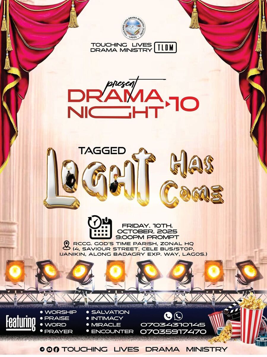 Join us for an inspiring evening with Touching Lives Drama Ministry (TLDM) as they present their Drama Night 10. This event promises a powerful showcase of faith, hope, and unity through captivating performances. Theme: LIGHT HAS COME β a call to illuminate the darkness around us and within us. πβ¨