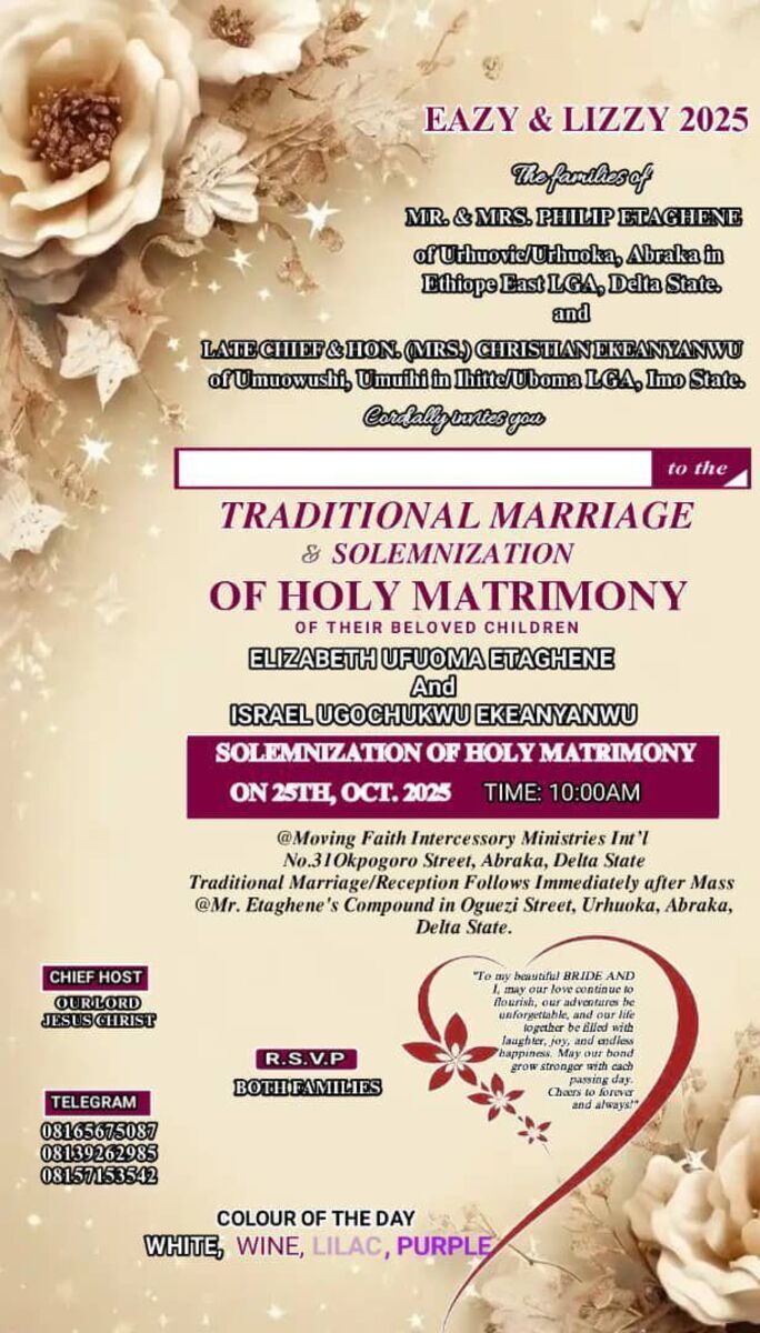 Celebrate love and tradition at our beautiful Traditional/White Wedding π! Join us for an unforgettable day filled with joy, laughter, and cultural elegance. Whether you're a guest, family, or friend, this event promises a heartfelt gathering with stunning rituals and memorable moments. Dress in your finest traditional or white attire and be part of a special celebration that brings hearts together. π₯β¨