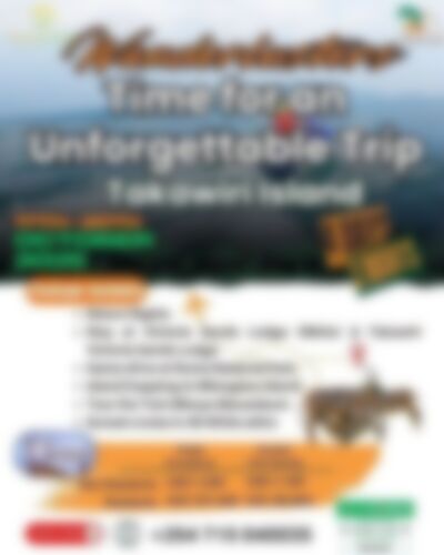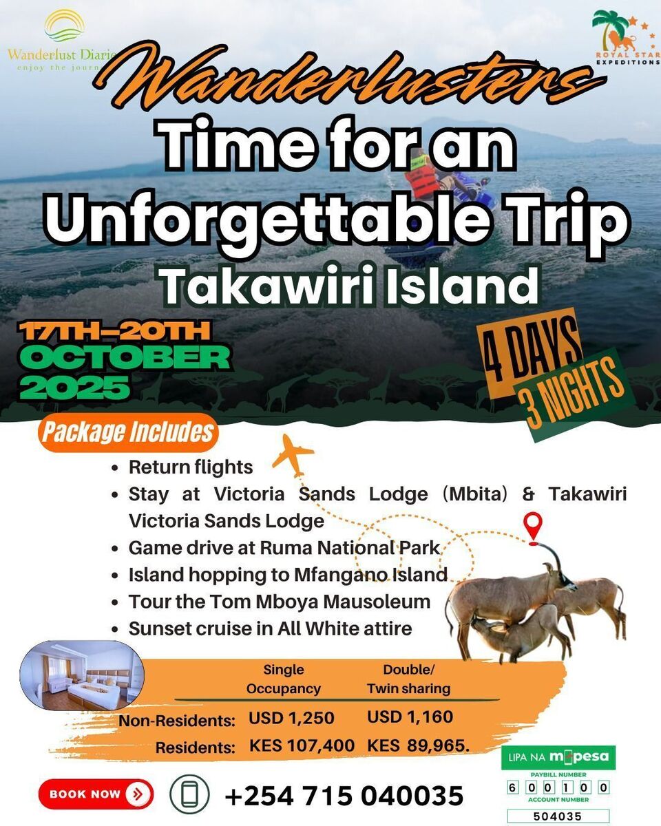 🌅✨ Embark on an unforgettable adventure to Takawiri Island with our exclusive getaway! From breathtaking island hopping, relaxing sunset cruises, to exciting game drives and cultural tours—this trip offers a perfect blend of relaxation and adventure. Stay at luxurious lodges, enjoy return flights, and immerse yourself in the natural beauty of Langata, Nairobi. Whether you're seeking a fun-filled escape or a peaceful retreat, this event promises memories that last a lifetime. Don't miss out—limited slots available! 🚤🏝️