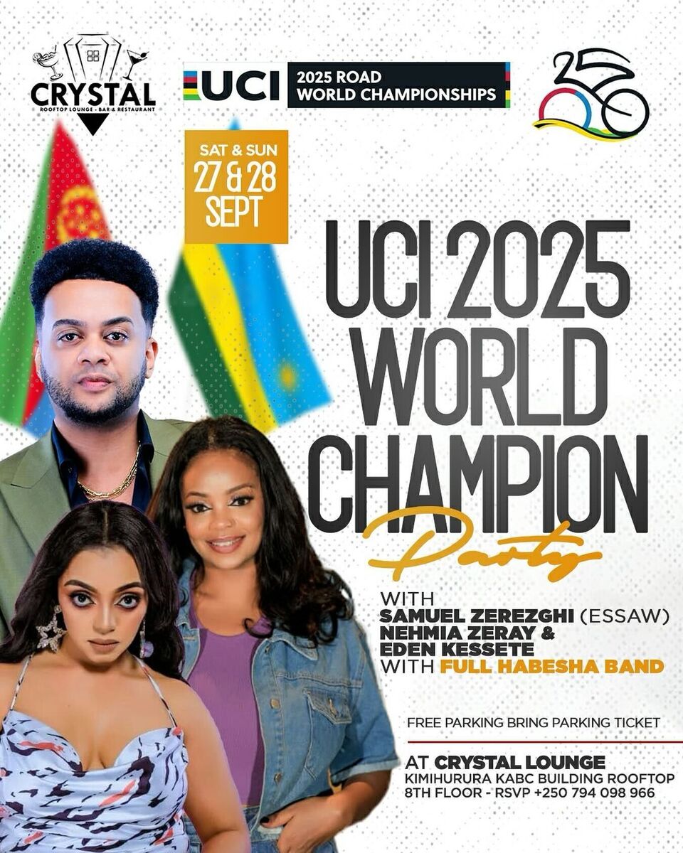 Get ready for an unforgettable UCI 2025 World Champion Party at the prestigious Crystal Lounge! ๐ Experience an exciting evening filled with music, vibrant vibes, and celebration as we honor the world champions. Set against the stunning backdrop of Kimihurura, this event promises to be a memorable gathering of sports enthusiasts and music lovers alike. Enjoy great company, lively entertainment, and an atmosphere buzzing with energy on the rooftop of the KABC Building, 8th Floor. Donโt miss out on this spectacular celebration! ๐ Contact: +250 794 098 966
