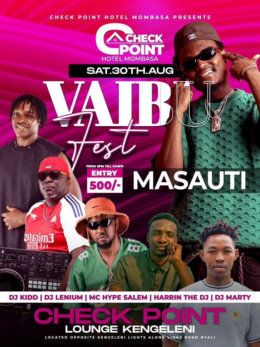 🎉 Get ready for an electrifying night at VAIBU FEST WITH MASAUTI! Hosted at the iconic Check Point Hotel Mombasa, this vibrant festival promises an unforgettable experience filled with energetic performances, lively vibes, and great company. Enjoy live music, dance, and celebration as top artists light up the stage. Whether you're a music lover or just looking for a fun night out, this event is the place to be! Don’t miss out on the hottest festival of the season — come join the excitement! 🔥🎶