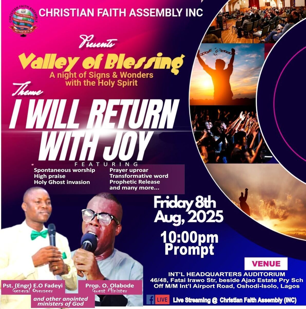 Join us for a powerful night of encounter, signs, and wonders in the presence of the Lord most High! VALLEY OF BLESSING is a night of divine manifestations and Holy Spirit activity, designed to transform lives and turn challenges into testimonies. Whether you’re coming with expectations or seeking refreshment, this event is tailored for everyone desiring a touch from heaven.