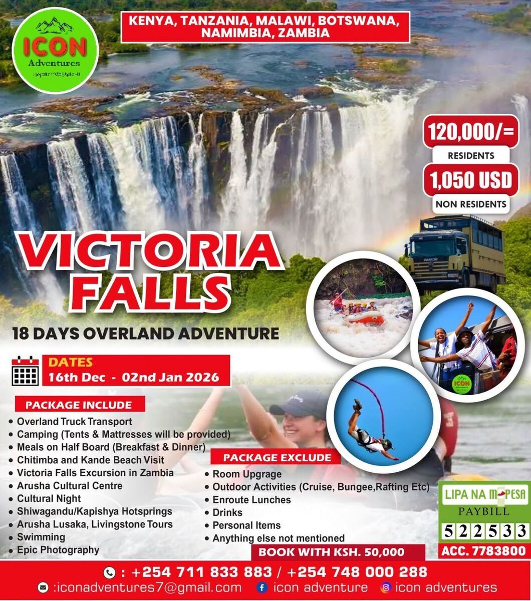 ๐ Embark on an unforgettable adventure with the Victoria Falls Mega Holiday Getaway 2025-2026! This exciting 18-day, 17-night tour takes you across some of Africa's most iconic destinations, including Namibia, Botswana, Zimbabwe, Zambia, Malawi, Tanzania, and Kenya. Explore breathtaking landscapes, vibrant cultures, and thrilling activities like safaris, river cruises, and cultural nights. Perfect for travel enthusiasts craving an immersive African experience! โ๏ธ๐